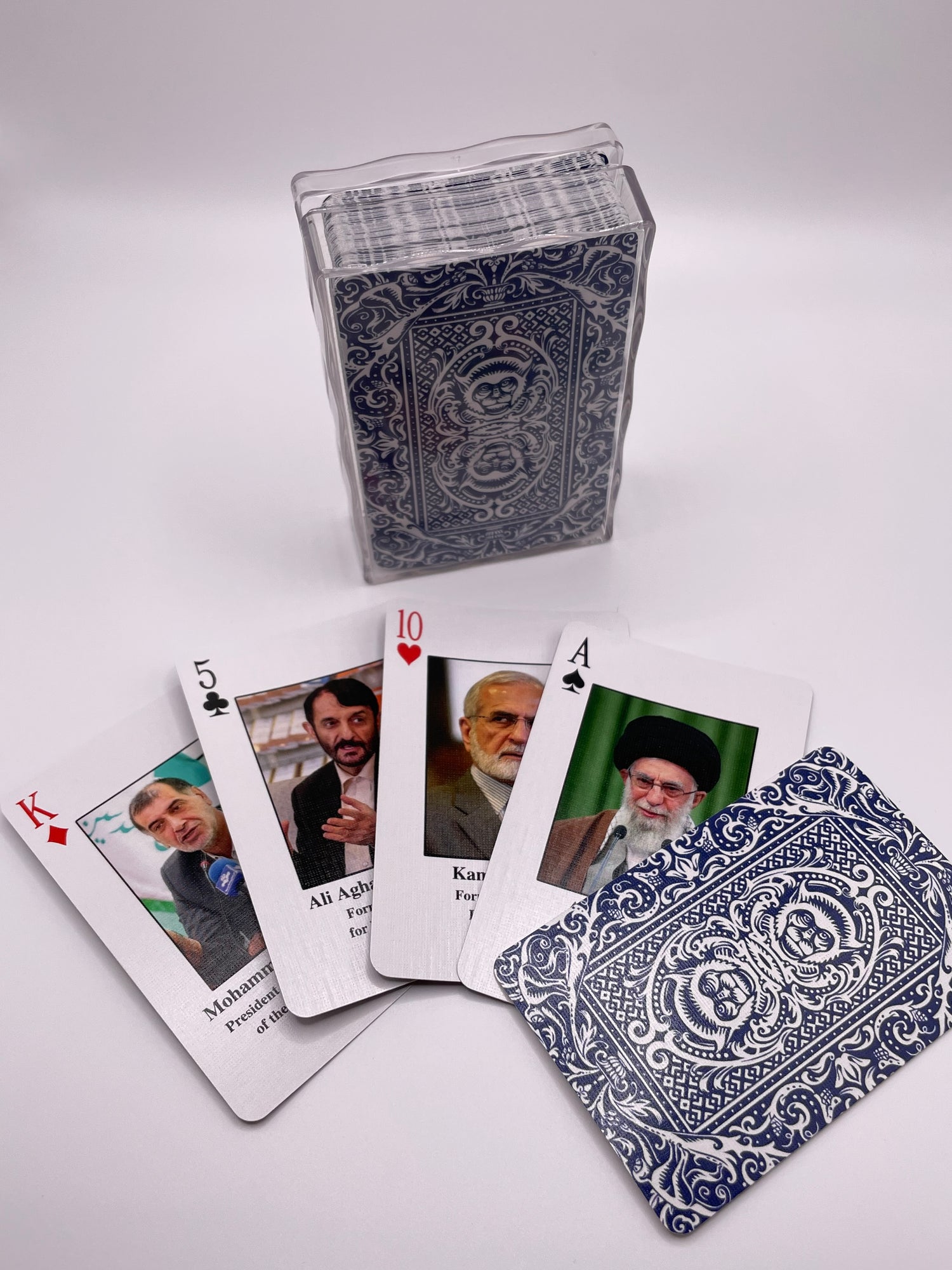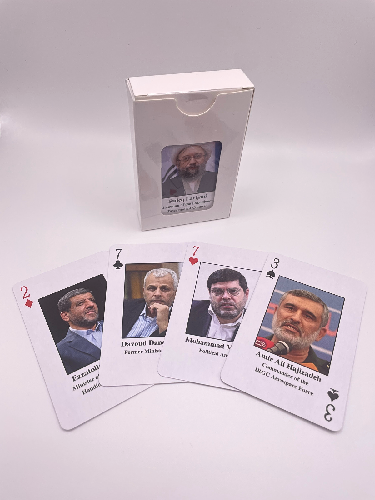 Our unique playing cards feature the faces of the corrupt political elite â from Supreme Leader Ali Khamenei, to former Parliament Speaker Ali Larijani, political analyst Mohammad Marandi, and beyond.